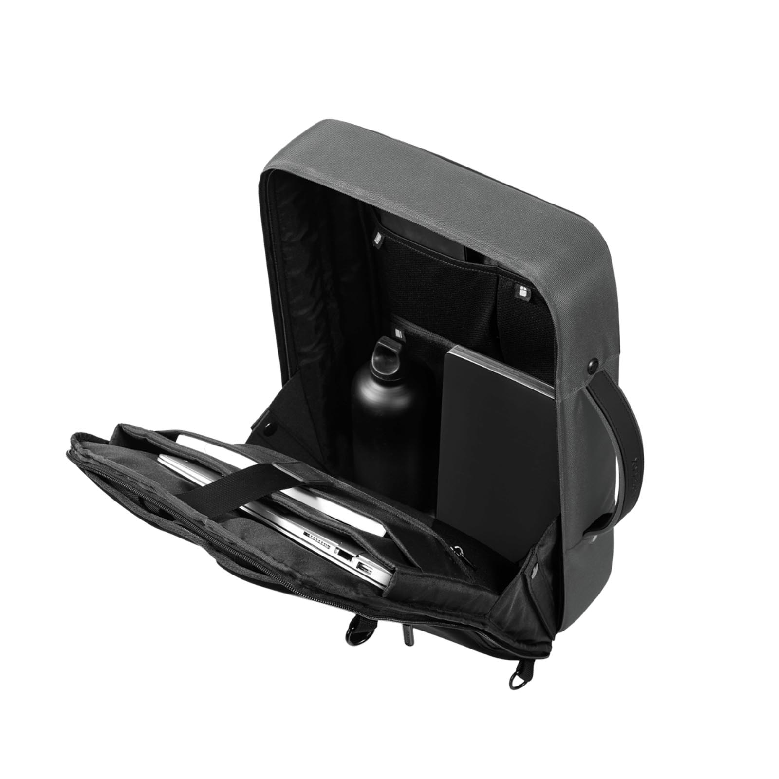 Рюкзак можно открыть на 30°, 90° и 180°. Когда надо быстро достать что-то на ходу — открывайте на минимум, а если хотите упаковать вещи на целый день — смело распахивайте Bizz 2.0 как чемодан.