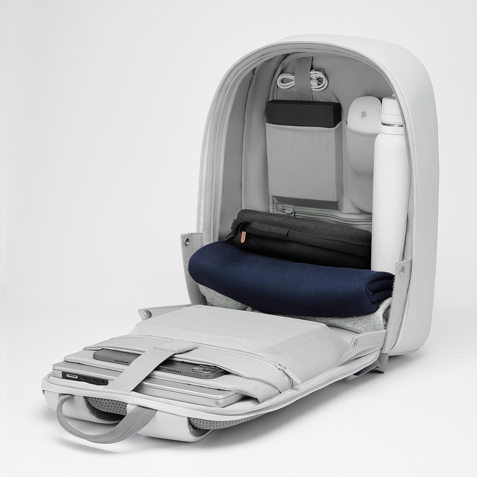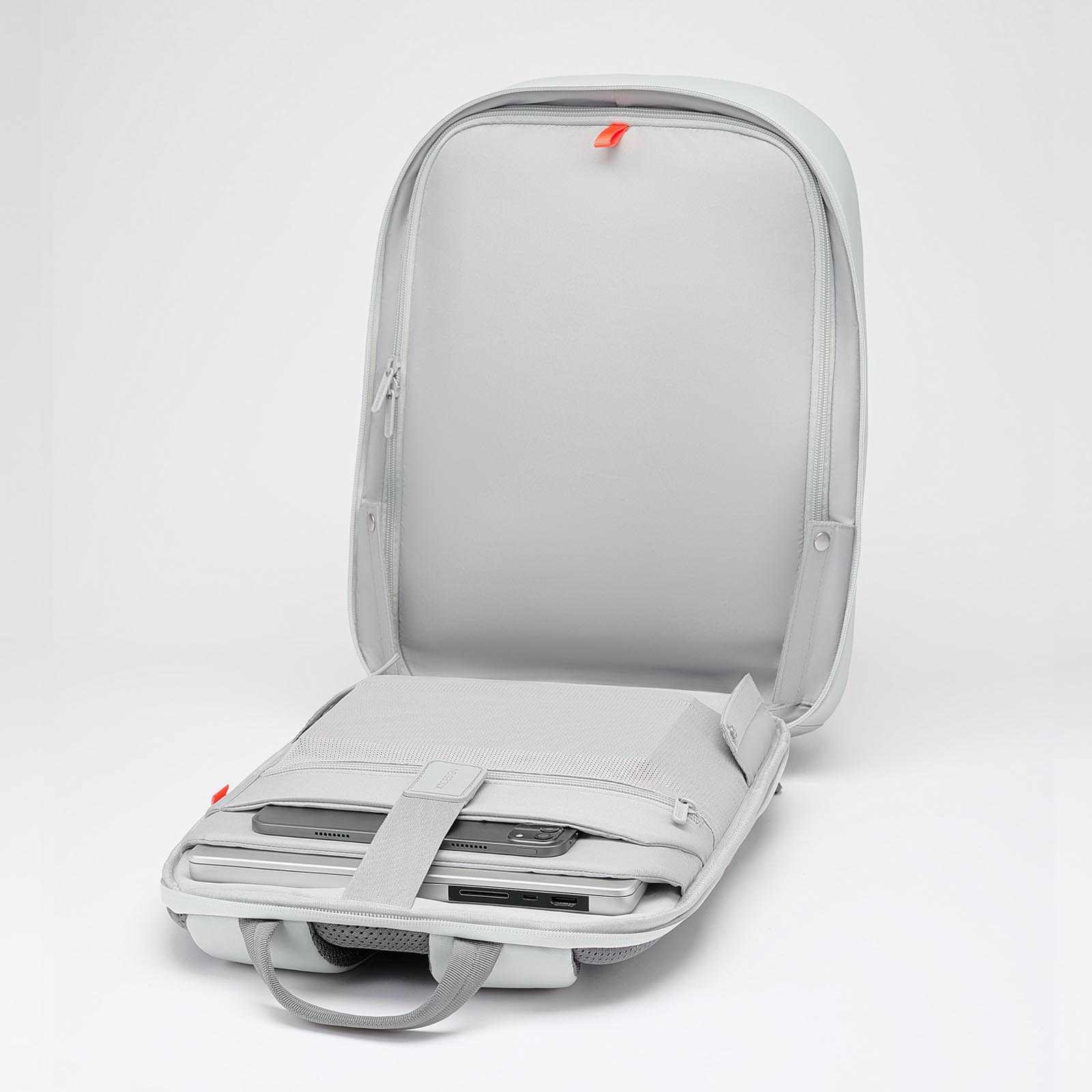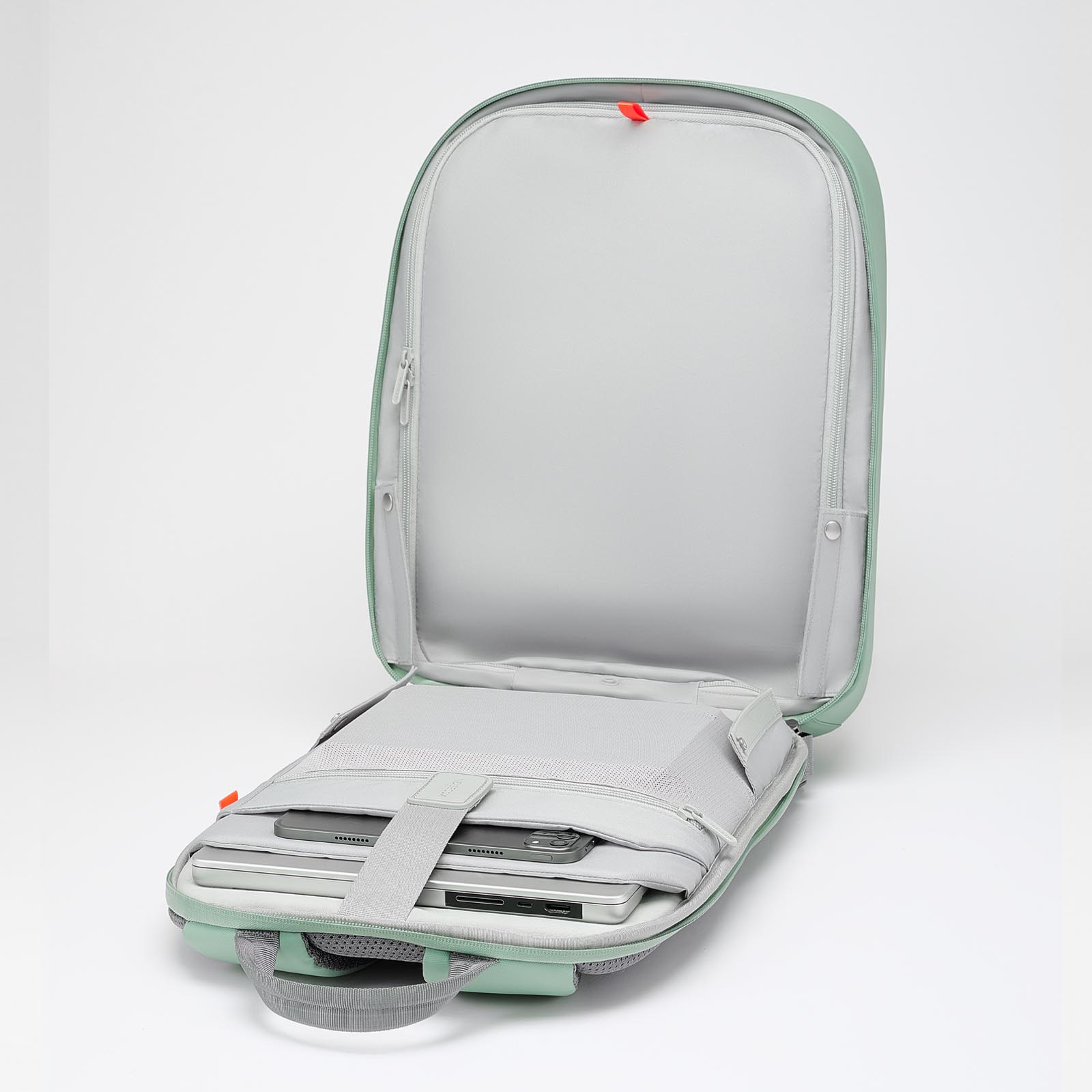 Объем рюкзака — 17 литров. Основное отделение можно разделить на два. Для этого достаточно расправить складную перегородку. Внутри — отдельные карманы для ноутбука до 16” и планшета до 12,9”. Отсек для ноутбука — с мягкой флисовой подкладкой, чтобы уберечь технику от царапин и тряски. Карманы для техники дополнительно фиксируются ремнем.