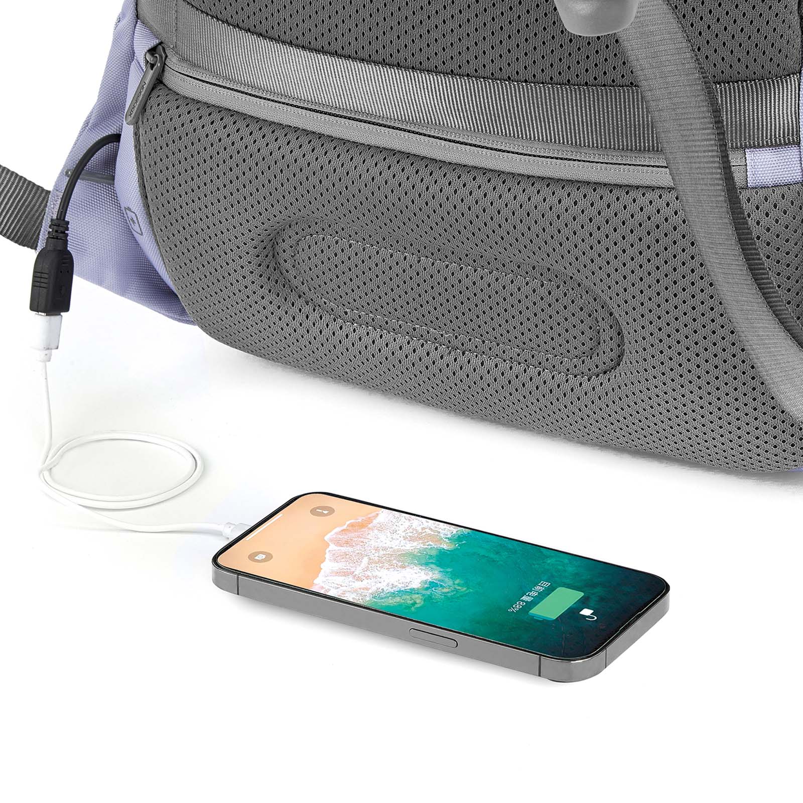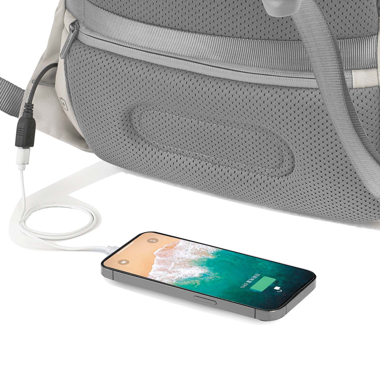 Во время путешествия гаджеты имеют свойство разряжаться. Положите в специальный карман внутри Bobby Soft повербанк, подключите его к USB кабелю. Снаружи, в районе правой лямки, находится выход USB, к которому можно подключить смартфон и заряжать прямо на ходу.