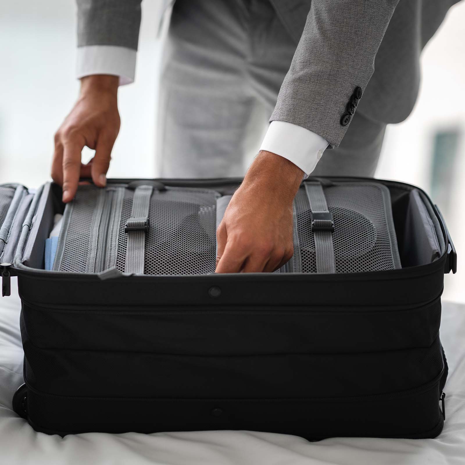 Flex Trolley — универсальное решение для перелетов, путешествий и повседневных поездок. За несколько секунд он трансформируется из сумки для ручной клади в деловой чемодан. При этом внутренний объем Flex Trolley увеличивается в 2 раза — с 15 до 30 л.