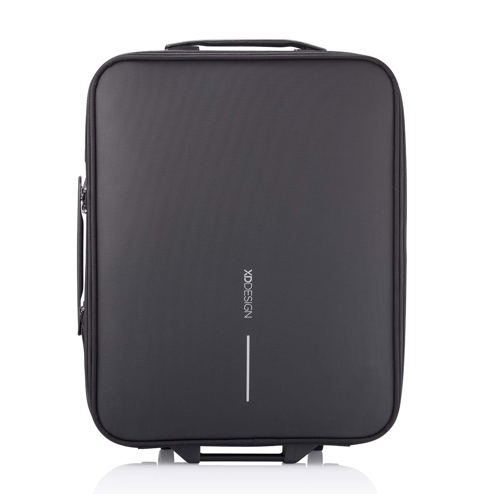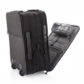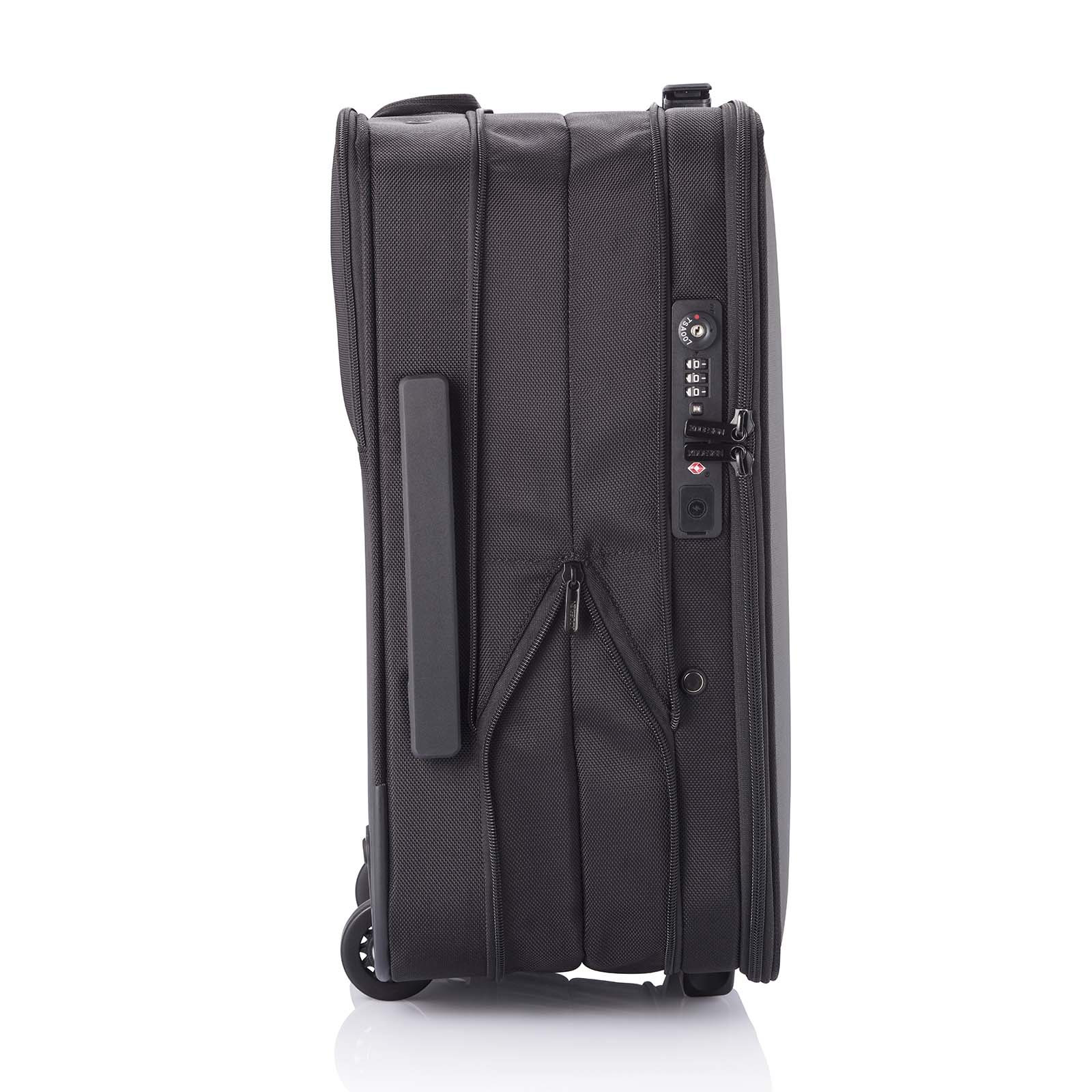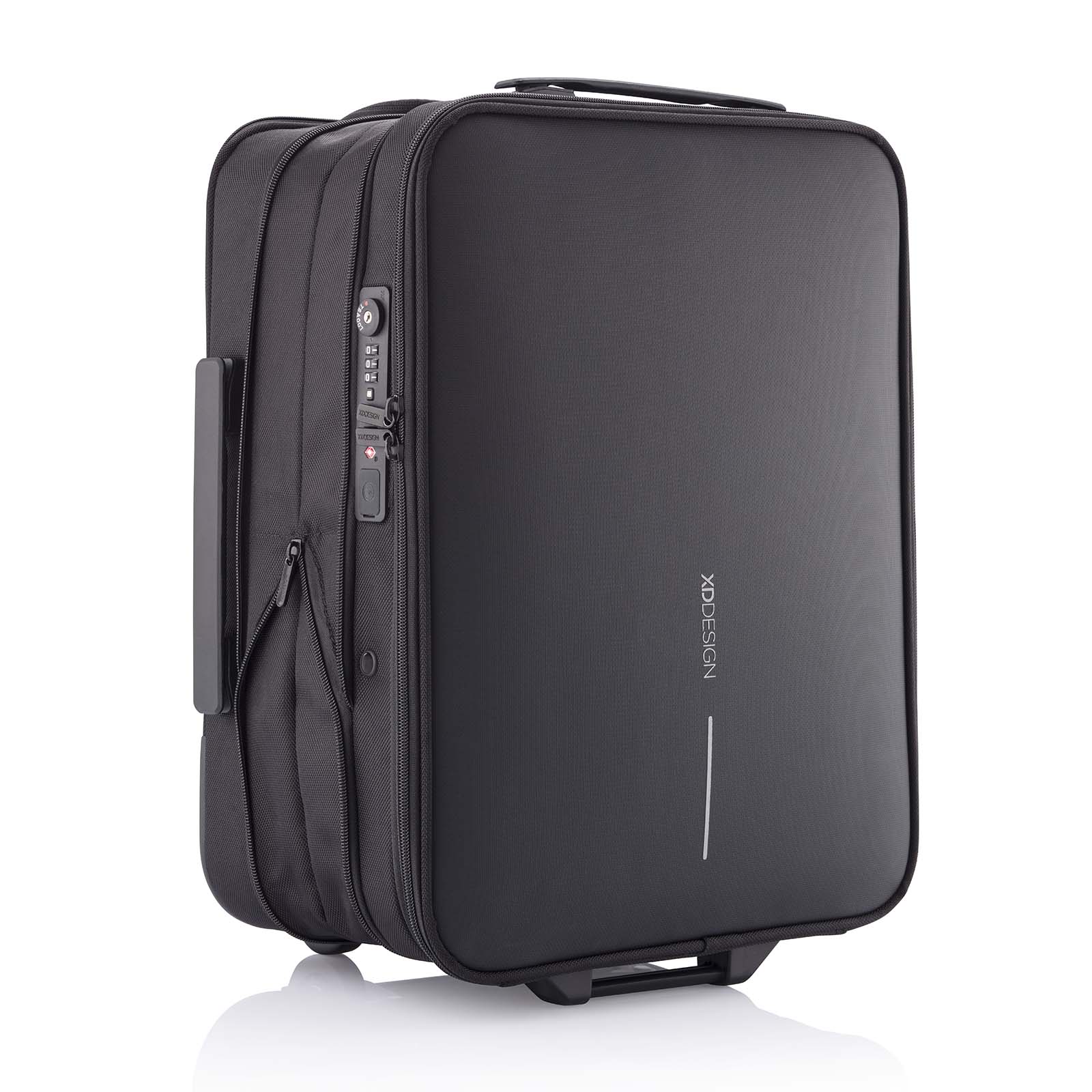Складной чемодан на колесах оснащен фирменной системой-антивор XD Design. Конструкция не позволяет посторонним получить доступ к вещам. Карманы Flex Trolley скрыты. Материал рюкзака — многослойный и препятствует прорезанию. Встроенный кодовый замок TSA фиксирует молнию основного отделения.