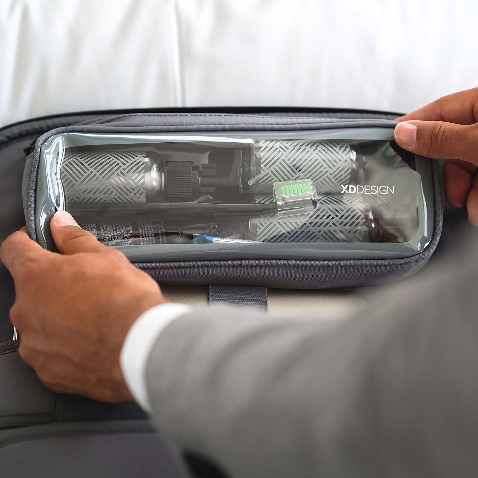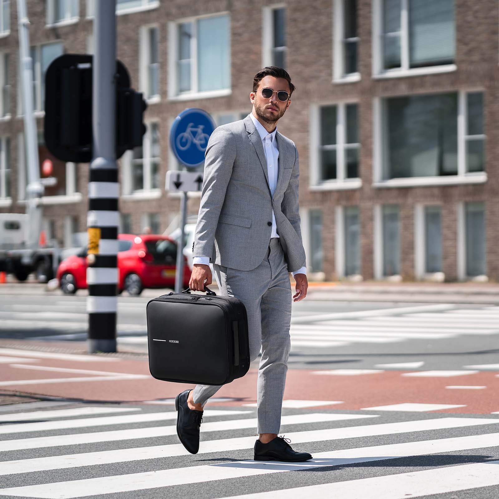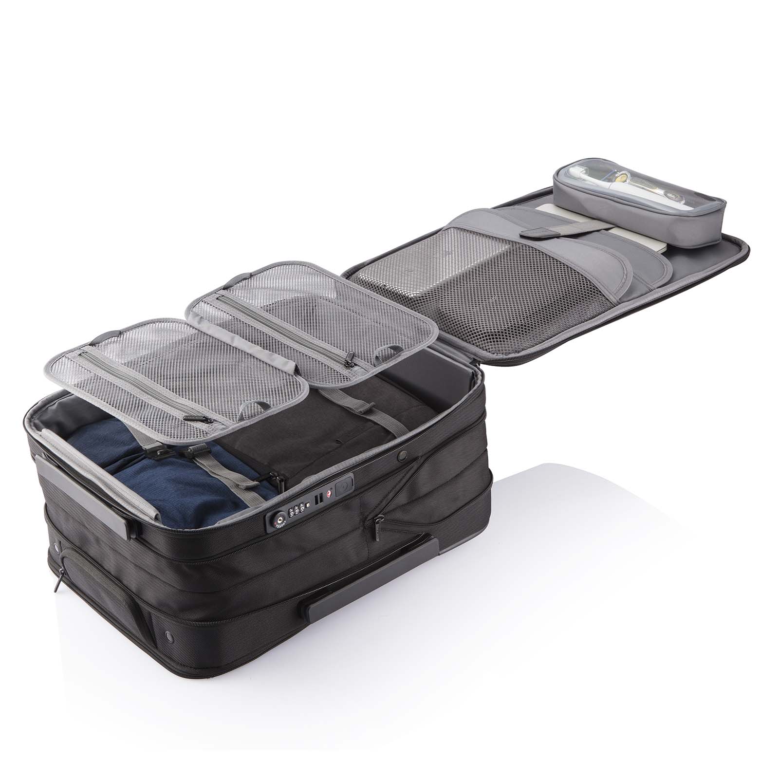 Складной чемодан на колесах оснащен фирменной системой-антивор XD Design. Конструкция не позволяет посторонним получить доступ к вещам. Карманы Flex Trolley скрыты. Материал рюкзака — многослойный и препятствует прорезанию. Встроенный кодовый замок TSA фиксирует молнию основного отделения.