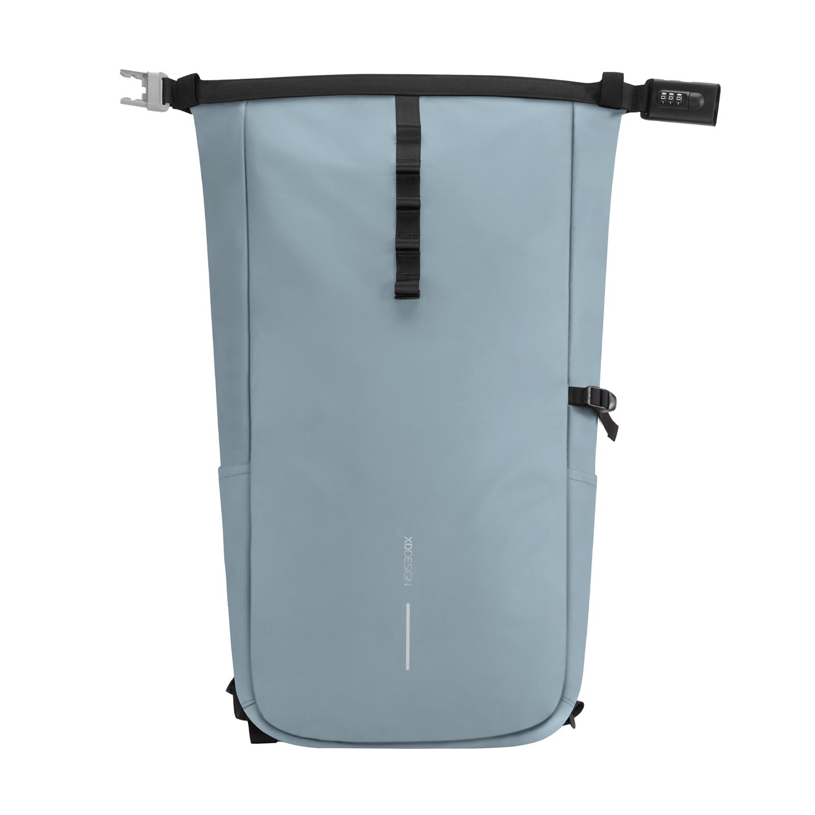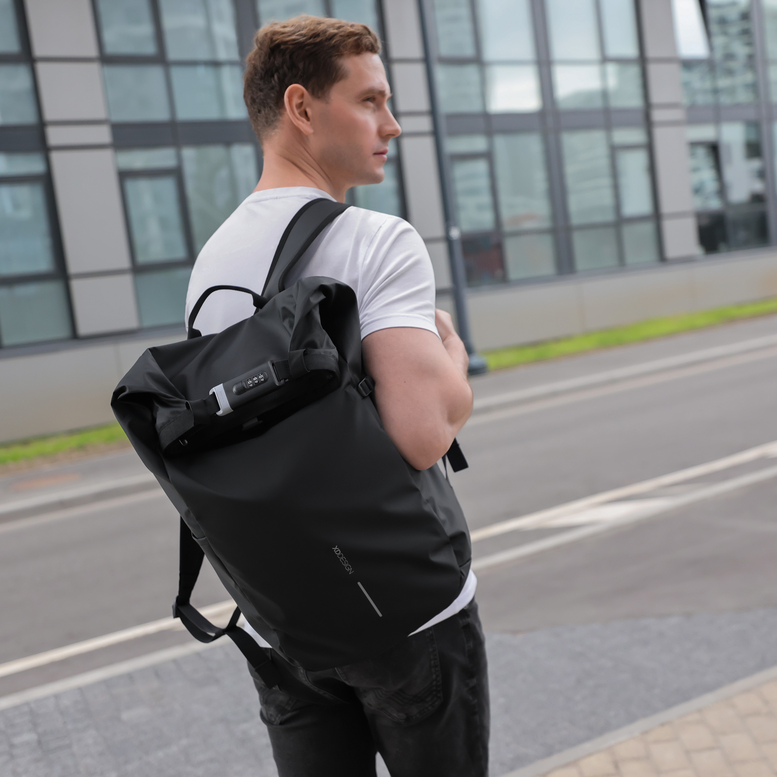 Верх рюкзака застегивается на молнию и скручивается. После этого края рюкзака можно соединить пряжкой и закрыть на кодовый замок. Такая система позволяет переносить высокие предметы, которые не поместились бы в обычный рюкзак. Или получать дополнительный полезный объем, когда это необходимо.